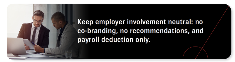 The solution is straightforward: keep voluntary benefits separate, avoid marketing them as part of a group plan, and make sure employees understand participation is entirely their choice.