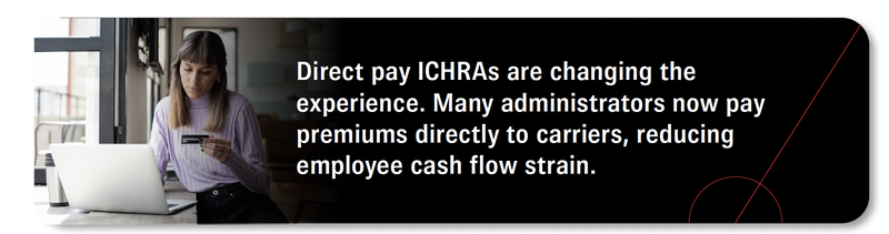 Direct-pay ICHRAs eliminate administrative pain points and reduce concerns such as employees struggling with large upfront premium payments, reimbursement delays or incorrect documentation, year-round receipt management, and manual reconciliation of payments.